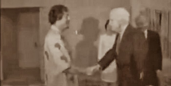 Qadafhi at his 'ranch' in Libya - interesting meeting with an interesting man." Yea, the same Qadafhi who most considered to be responsible for several major terrorist acts and the same man known as the "Mad Dog of the Middle East". He had been working toward some form of mainstream acceptance for some time. Putting himself out there as a leader of the African Union. Of course all that came to an end with him being shot dead and dumped into a ditch following the NATO backed push to oust him in which McCain accused Obama of "leading from behind". The funniest thing about the McCain/Qadafhi handshake which is seen in the video but not as much in this screen grab is the slight bow McCain made