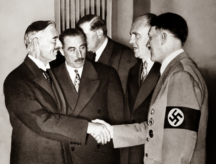 The one to which right wingers most like to refer is the infamous handshake in Munich in 1938 when British Prime Minister Neville Chamberlain shook hands with Adolf Hitler. The agreement allowed the Germans to take over part of Czechoslovakia that was primarily inhabited by German speaking peoples. The act would forever be known as the archetype of appeasement. The right wing likes to compare Obama to Chamberlain on, well almost daily actually. There's always a reason in their minds to make the comparison. Any time any diplomacy is involved the characterization raises its head. It comes up as many times as the comparisons between Obama and Hitler or Obama and the Antichrist.